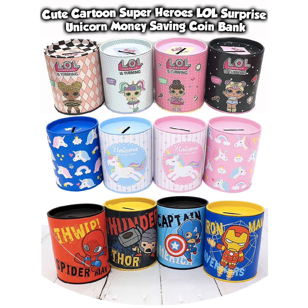 Cute Cartoon Super Heroes Lol Surprise Unicorn Money Saving Coin Bank Duit Tabung Tin Can For Boys Girls Kids Shopee Malaysia